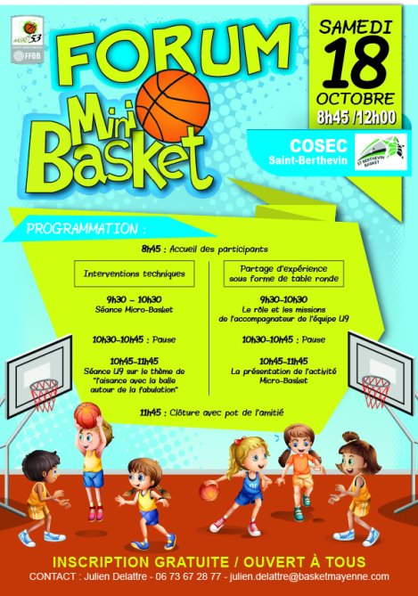 Voici le programme du forum mini-basket qui aura lieu au Cosec de Saint-Berthevin :
